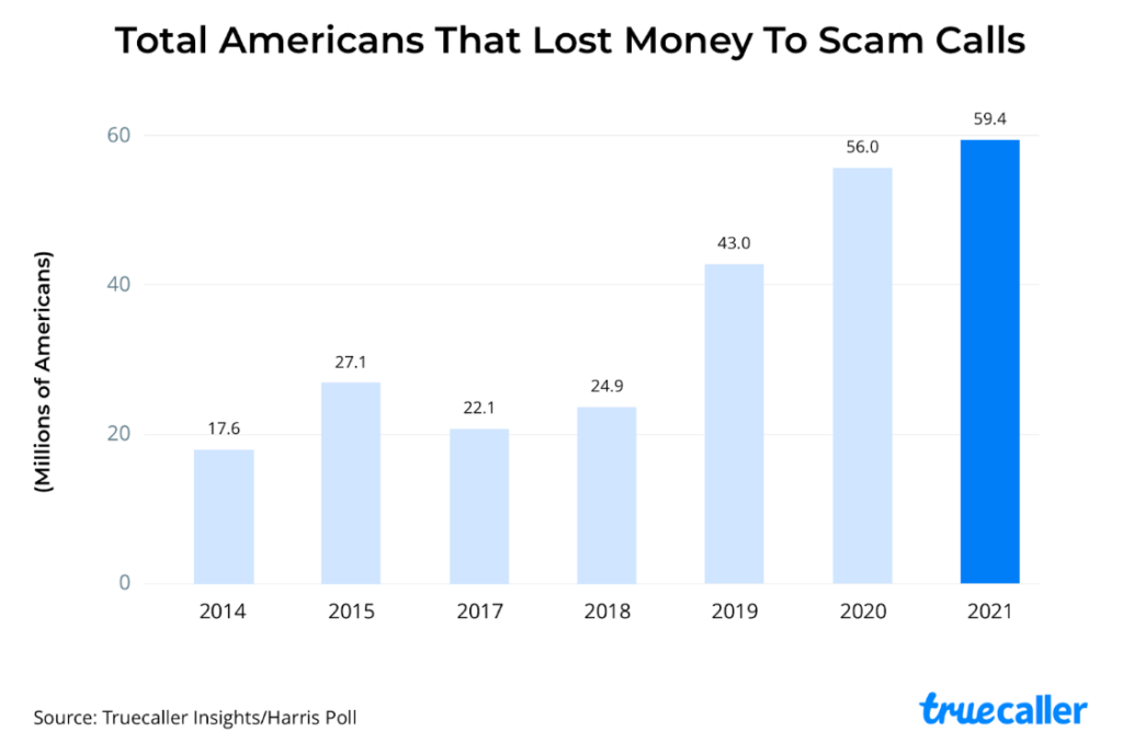 According to the recent Truecaller Insights US Spam & Scam Report, 59.49M Americans (23%) report having lost money as a result of phone scams during the 12-month period – up from 56 million (22%) in the previous 12 months. The average monitory loss was $502, up from $351.